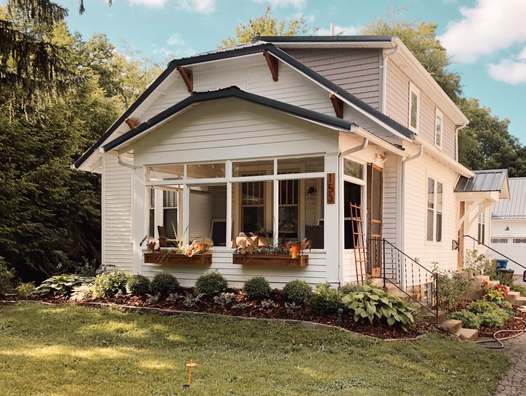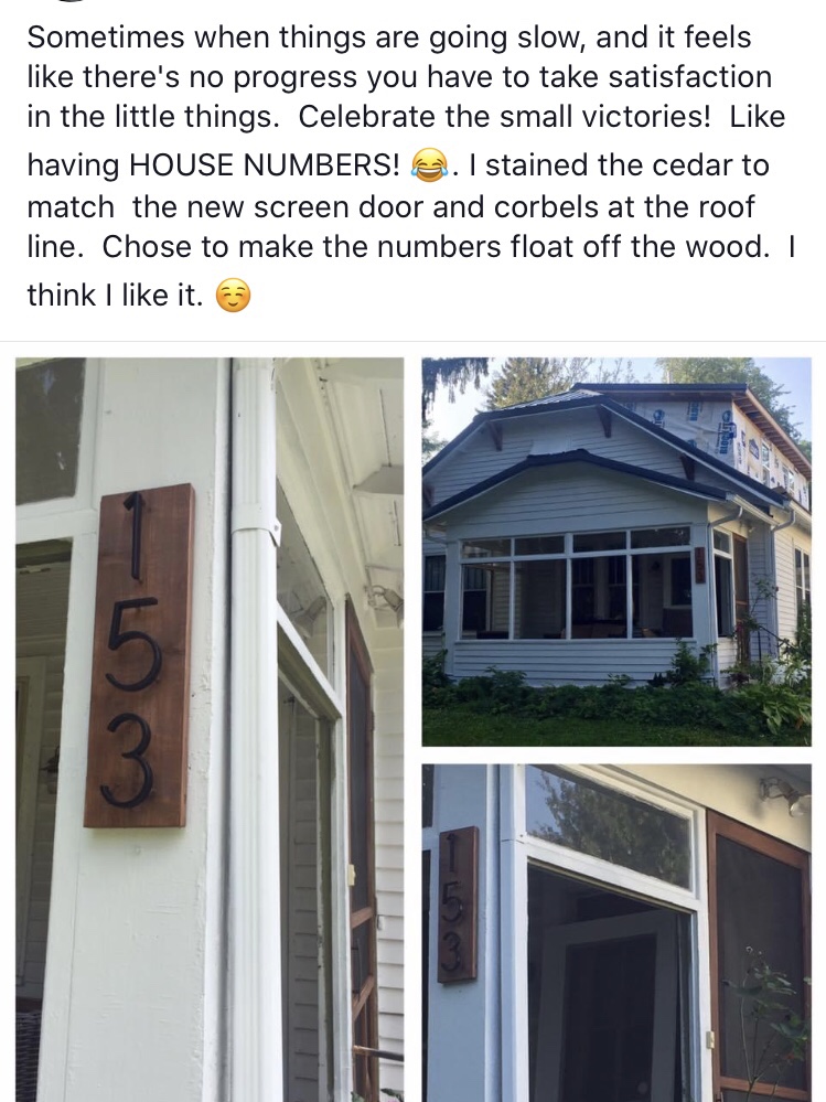 To tie in the wood corbels I also added a wood base for house numbers (I used a piece of cedar and floating black numbers from Lowe’s), a vintage style porch screen door from Menard’s, and had window boxes made for under the porch windows. Didn’t those windows just scream for window boxes? Credit goes to my neighborhood pal Jon for building them for me! I stained all of these items with the same Olympic Stain I used on the corbels to tie all the wood elements together.