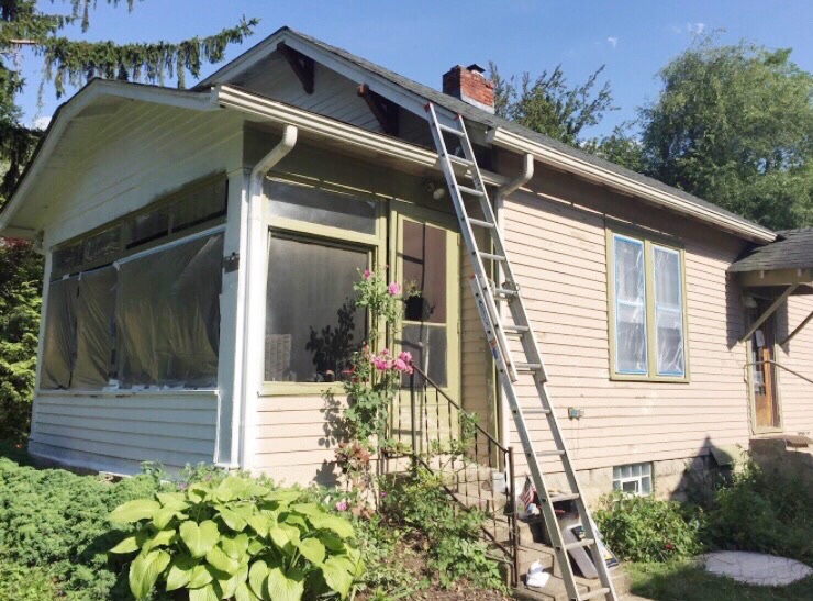 Now, to make all of these wood elements really pop. We did debate over paint colors. Dark blue siding with crisp white trim, anyone? But decided to go with a classic — and likely what she was originally — white. I’ve never painted a house before, and because of the age of the house we were concerned about lead paint so we decided to hire an expert. HA! They came and power washed the house and allowed all the lead paint chips to simply fall to the ground. (FYI…that’s NOT how it’s supposed to be done.) They agreed to come back with a shop vac and clean everything up, but then proceeded to start the first painting day by not taping off the windows or corbels and we had to fire them. (In hindsight I definitely shouldn’t have hung the corbels until AFTER we painted. Live and learn!). So guess who got to try a big paint sprayer for the first time? Me! We rented a sprayer from Home Depot and just made it work.