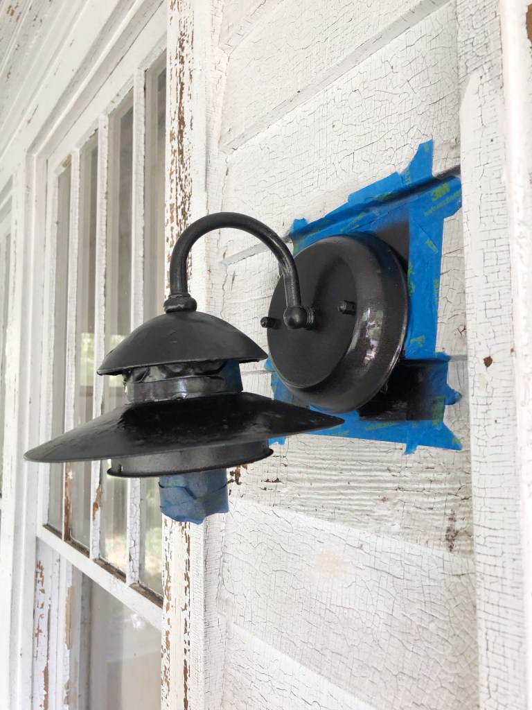 There’s an old light fixture next to the door. Super cute, jelly jar style that’s old old old. I couldn’t part with it, but it was rusty and gross so it got hit with this oil rubbed bronze Rustoleum metallic spray paint. It’s primer and paint in one which always makes life easier, and I used it to refresh the railings on the two sets of stairs up to the house as well.