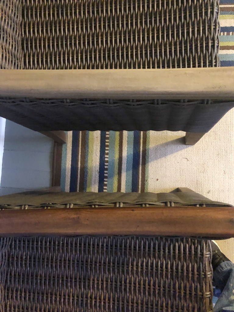 That pretty much sums of the actual porch remodel. Then it was on to the fun stuff — decor! I had a set I bought secondhand from Craigslist years ago. It’s a mix of wood and resin wicker, and the wood looked pretty sad. I sanded it all down and did a new coat of stain and varnish. I am so pleased with how they came out. Almost like brand new! I added few hanging lanterns (curbside finds), a hanging swag kit and drum shade from World Market, cushions and pillows (Pier One), garden stool (in green) and glass topped metal side table (which also got an oil rubbed bronze treatment courtesy of Rustoelum). Now it’s just such a cozy spot to hang out.