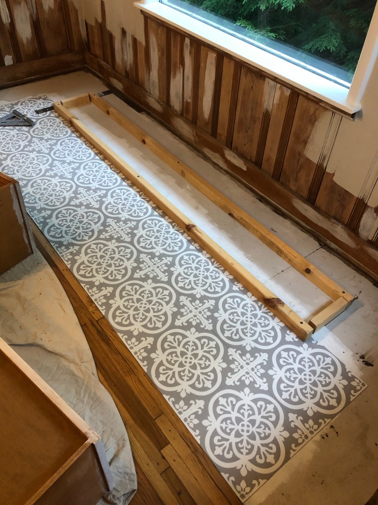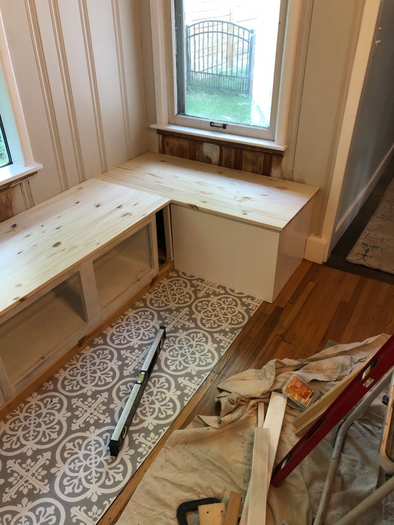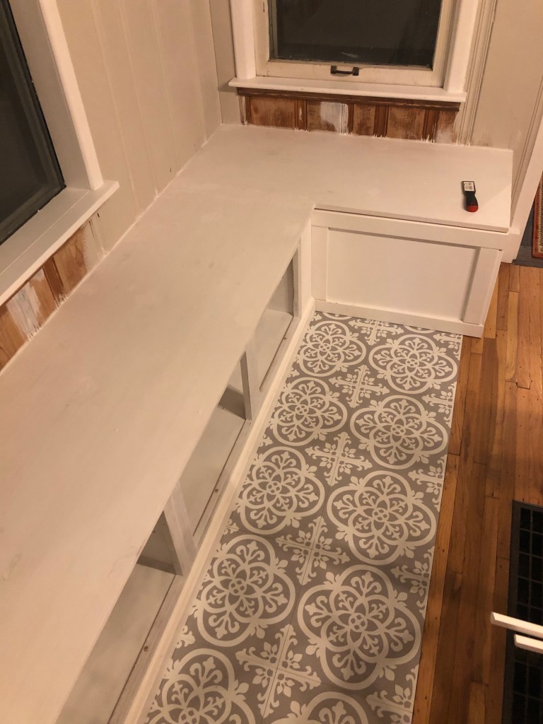 To solve the problem of this bump-out addition, I added peel and stick floor tile and built a U-shaped bench seat.