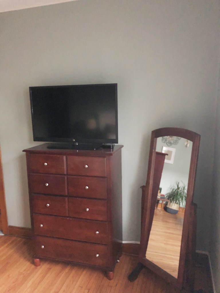 This is a REAL sad corner of the room. I like the antique mirror I got off of FB marketplace, but the cherry dresser and TV are no bueno.