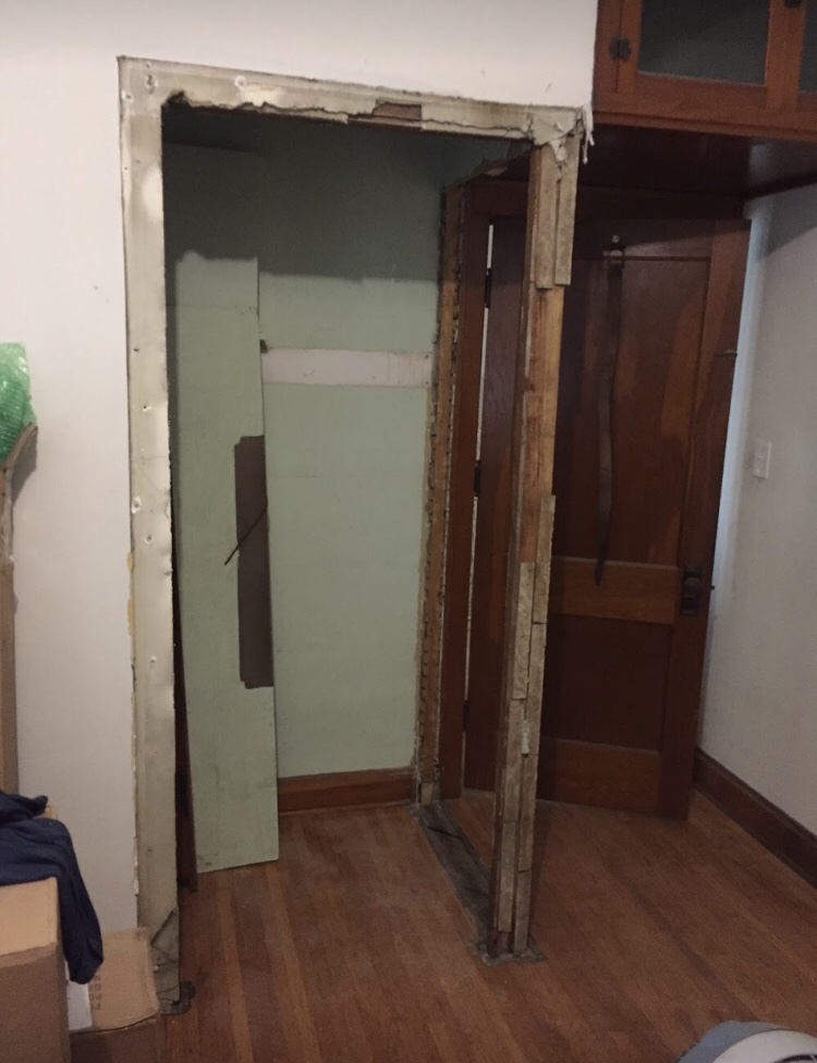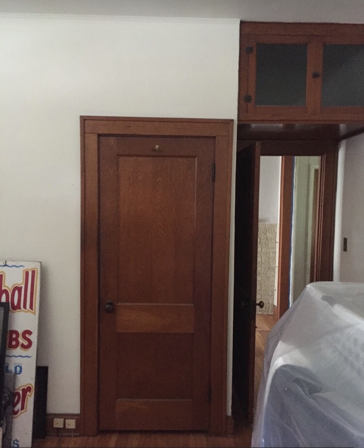 This is the original closet door, on the wall opposite from the new closet door. A little switcheroo and this will become the door to the new closet.