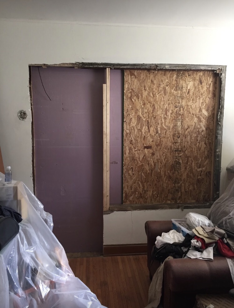 The original back wall. Sad to say goodbye to those windows and sconce!