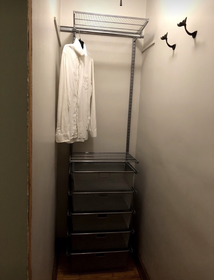 This is my husband’s closet. He spent a ridiculous amount of money on this sad Elfa system from the Container Store. Separate bathrooms and closets save marriages — I firmly believe that.