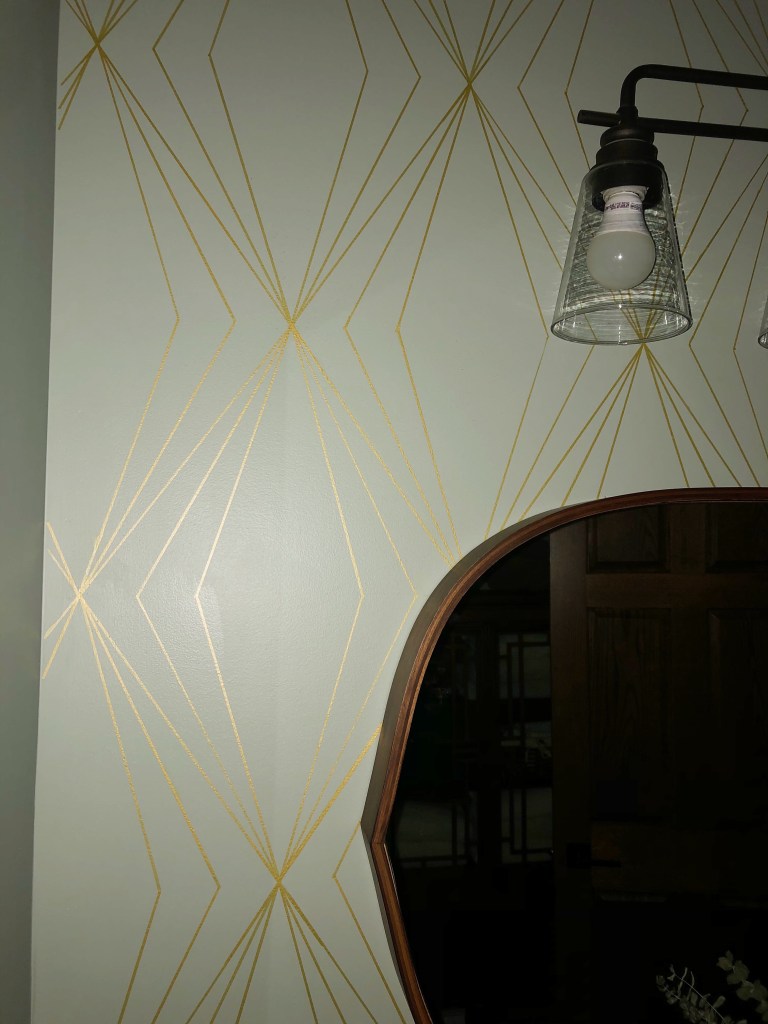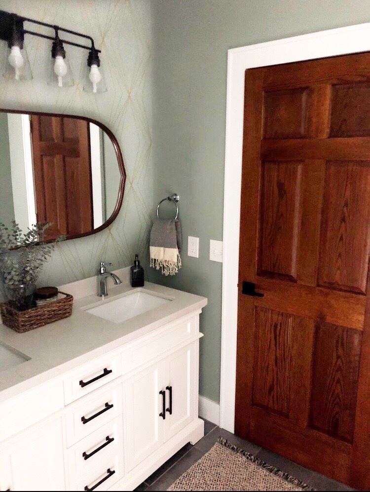 These two rooms got painted — you guessed it — Sherwin Williams Oyster Bay. As I’ve said before, it’s my favorite color. A somewhat moody bluish-green that feels warm and cozy. Now for the really fun part, and the best $4 I’ve ever spent in a design. On the vanity wall I chose to do a Sharpie paint marker (yes, a Sharpie marker) faux wallpaper. I’m scared of real wallpaper and I swore I would never stencil again so…. anyway, a Pinterest search led me to Vintage Revivals and a design that I thought I could handle. You can check out the details here. It was quick, relatively painless and SO SO inexpensive. 10/10 recommend this upgrade!
