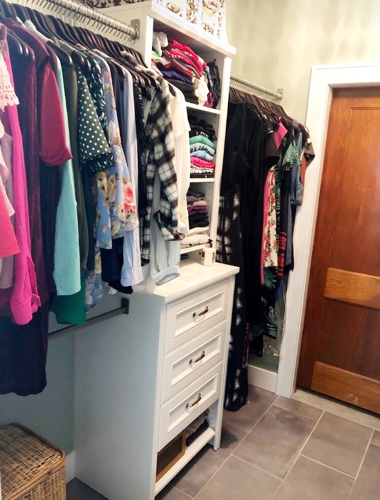 I guess you could say I went “cheap” in the closet. I purchased two different Closetmaid systems from Facebook marketplace (seeing a trend?) that had been purchased at a FastTrack auction, were still in the boxes and a really great price. I could have been sad that one was white and the other a “cherry” wood, but I decided to make the best of it and call it a “his and hers” closet (even thought it’s mine all mine). There’s so much space in here that I gave up my dresser and moved EVERYTHING I own in. And there’s room to spare! Maybe someday I’ll upgrade to a fancier, custom closet system, but this is working surprisingly well for me.