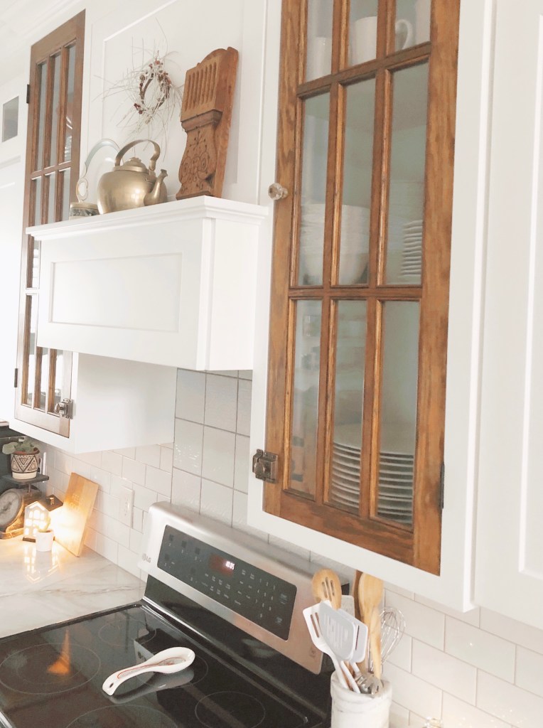 So how to make it look more high-end and custom? I wanted to do a couple of things. First, I wanted a warm wood element in the kitchen. Something old to mix with all this new. I found two 9-paned glass doors for sale on Facebook marketplace for $30. I had a woodworker create two cabinets to fit the doors and flank the range hood. I painted the cabinets using the trim paint, and kept the doors their natural wood. I LOVE them, and think they really make the kitchen look unique.