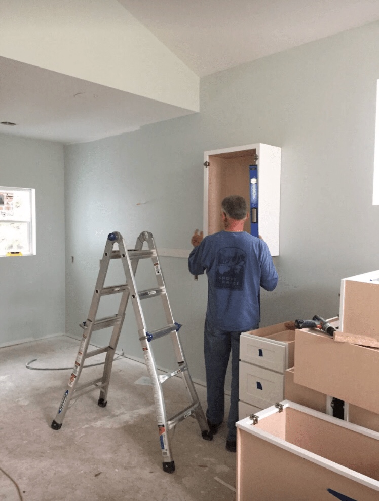 My father-in-law came down for a weekend and he and I installed the kitchen cabinets. Most were fairly straightforward, but that island sure gave us a run for our money! We used 30″ wall cabinets on the back side of the island to have more storage. This means we had to build a 4.5″ platform to raise them to base cabinet height and match up with the base cabinets on the other side. We hid the platform with base molding. I also wanted side supports for the countertop overhang and a space for the bar stools to tuck into. This means we had to create structure for all of that, and use the included “skin” to cover it all up.