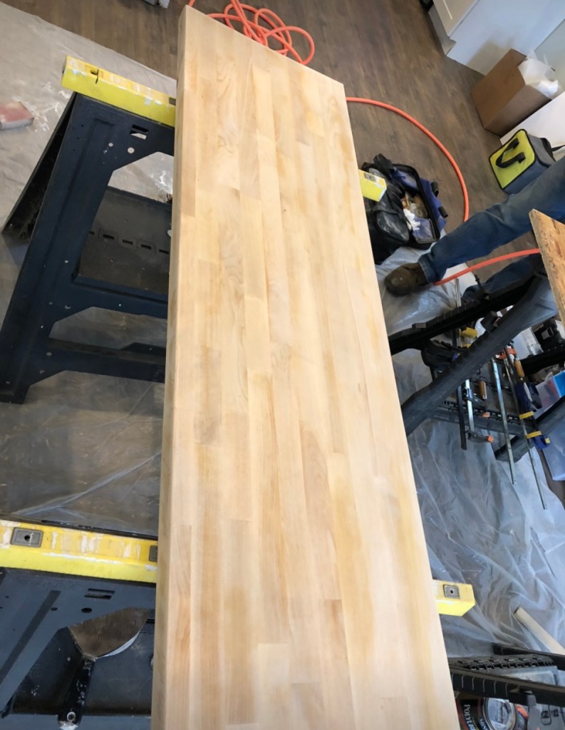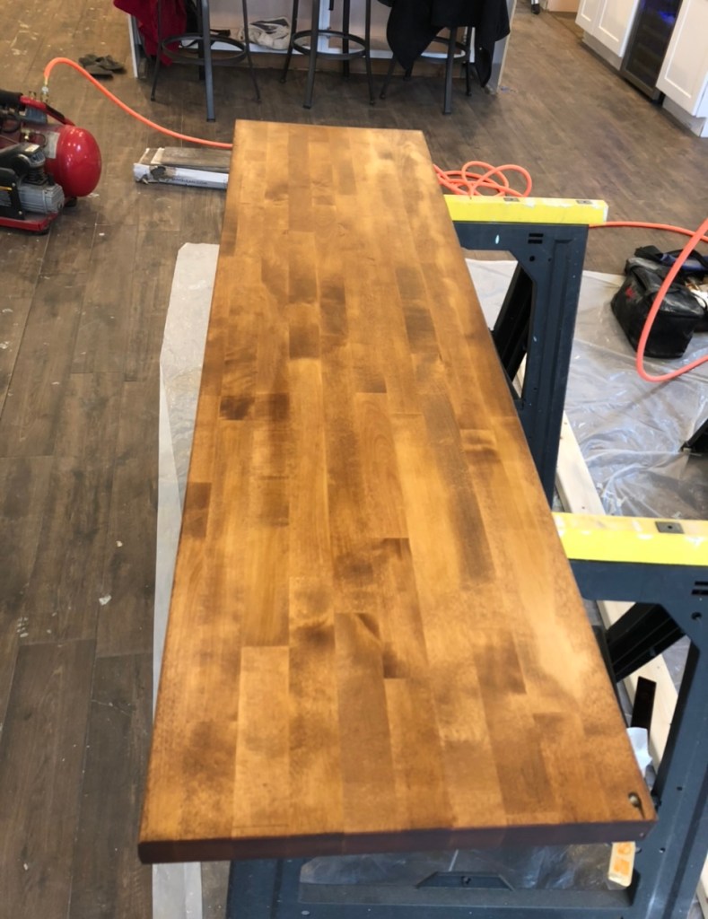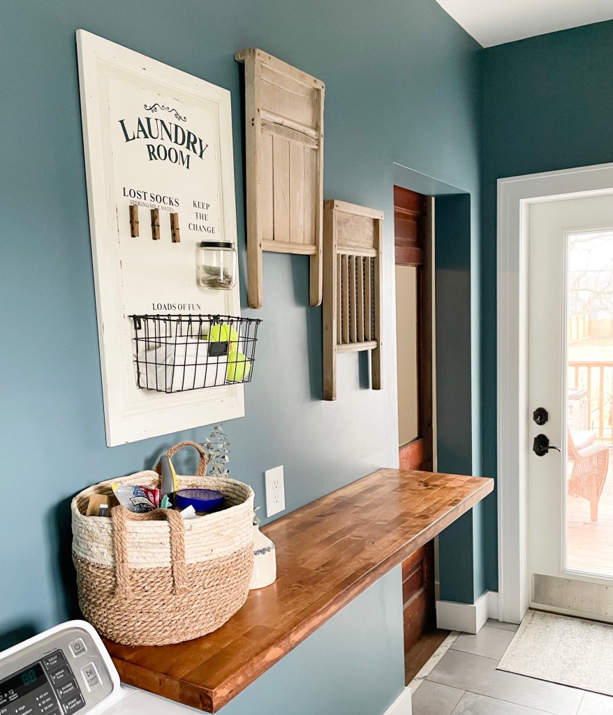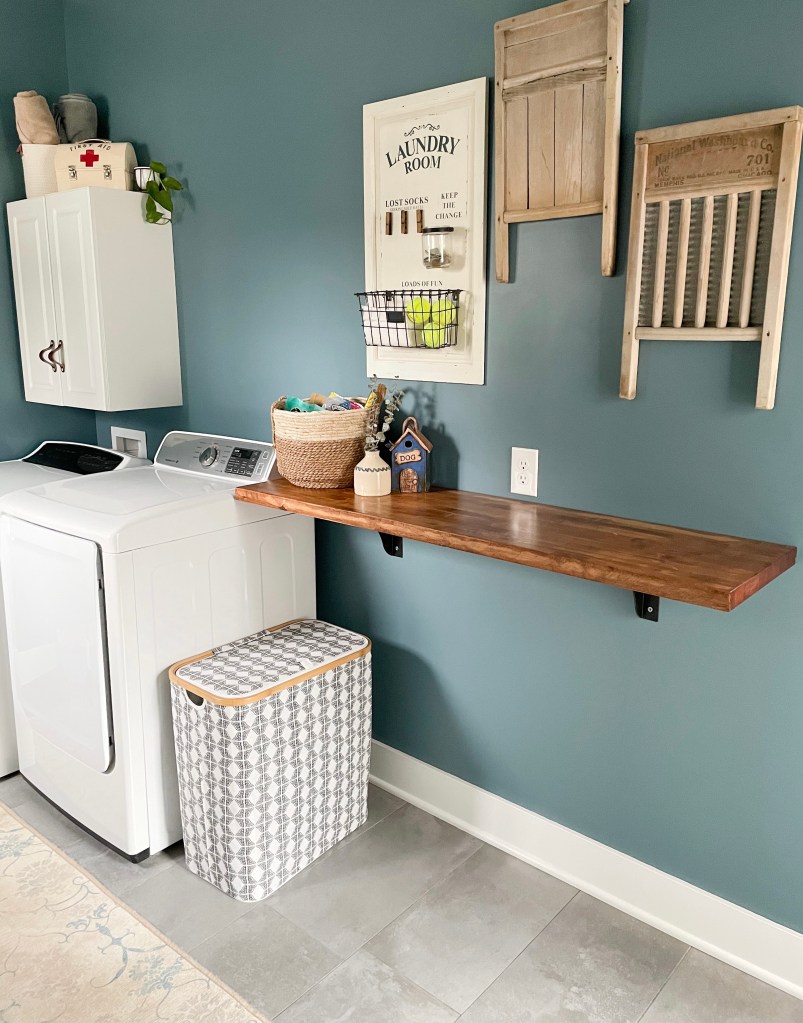 The countertop was an old butcherblock counter that someone ripped out of their kitchen and sold to me for cheap on Facebook marketplace. I sanded it down and removed the many many layers of finish. Because I was using it in the laundry room and it doesn’t need to be food-safe, I finished it as I would any other wood project. Just stain and a few layers of polyurethane.