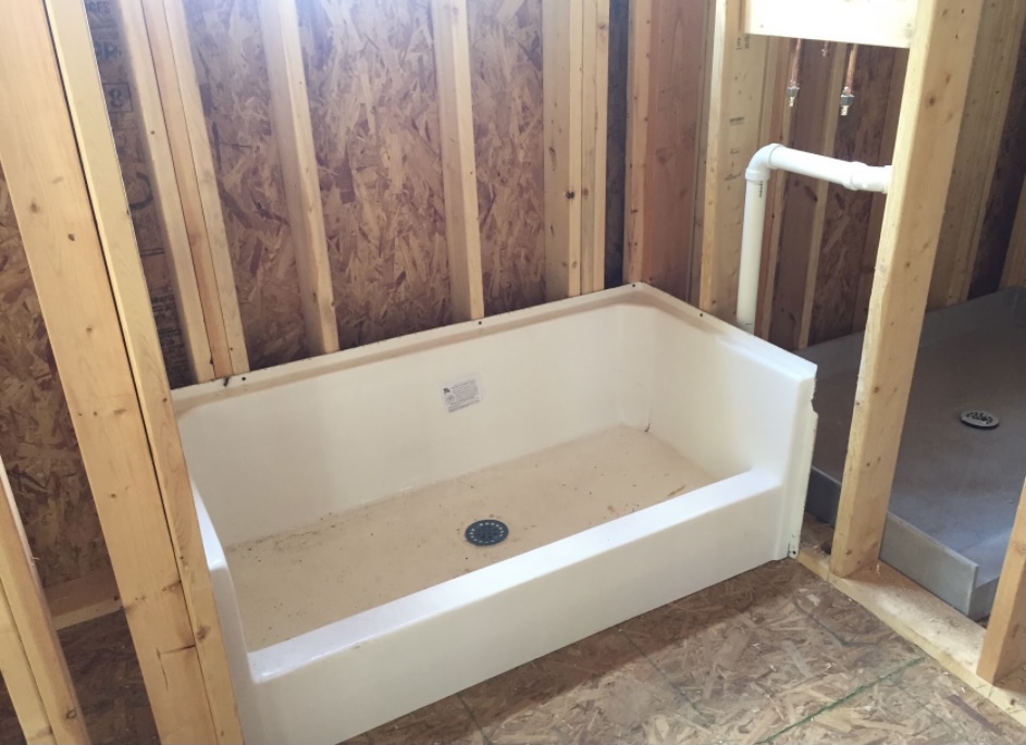 Once the design was in place and the contractors did the framing and drywall we had the plumber install the dog wash parts. I ended up buying a shower pan made for a mobile home in order to get the size we needed. It has molded fiberglass sides that come up higher than a traditional shower pan would.