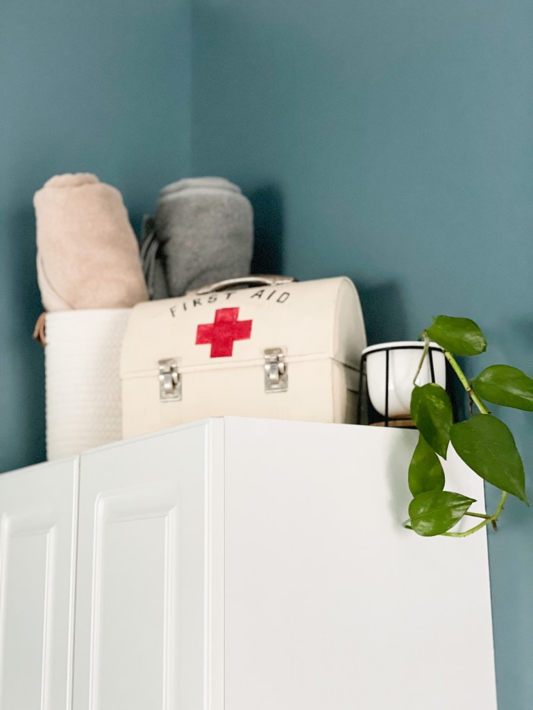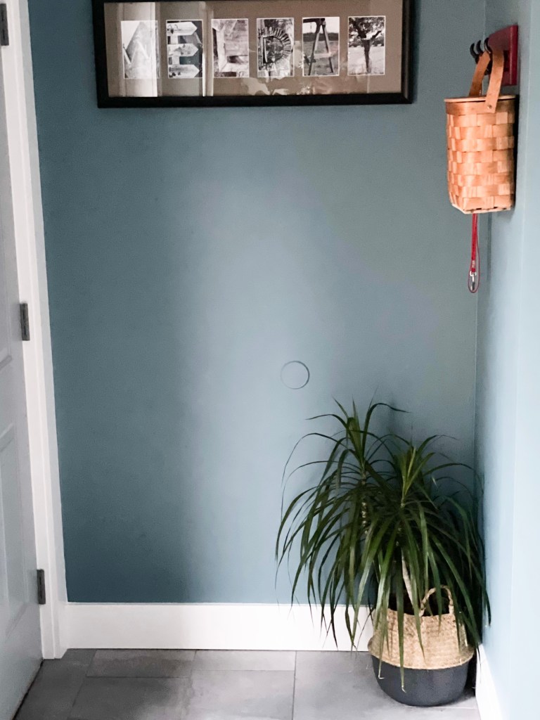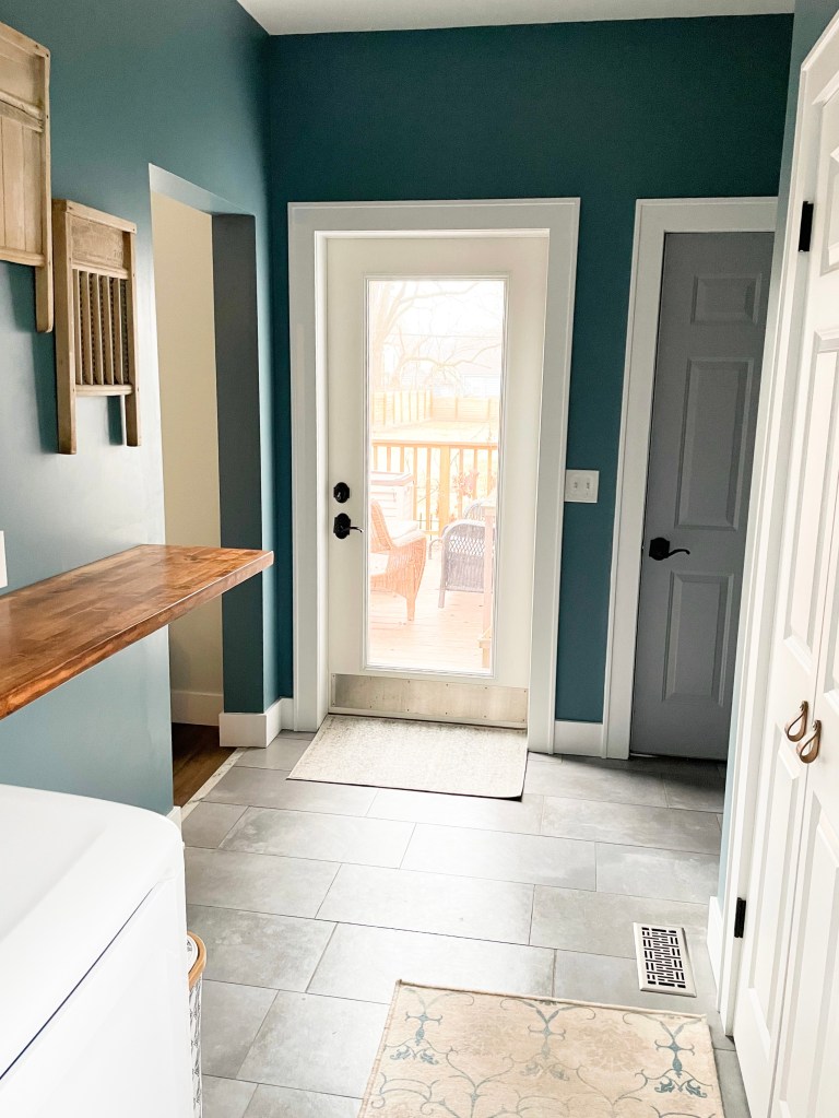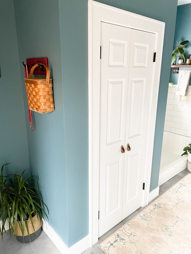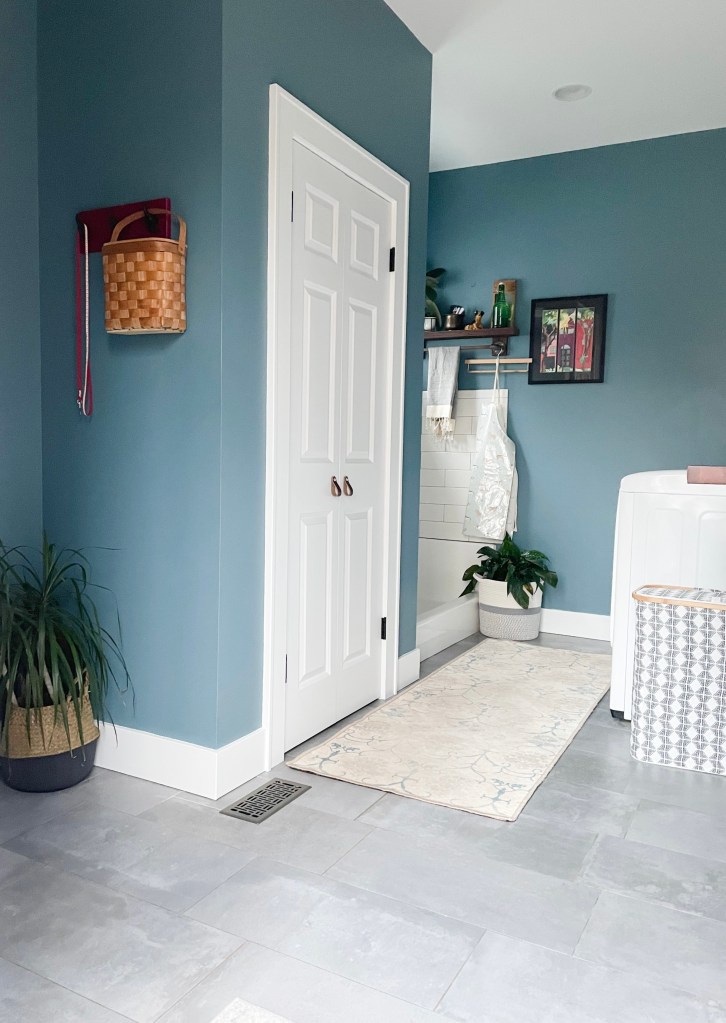 Because I knew there would be a lot of white in this room (appliances, closet doors, wall tile and shower pan), I decided to go dark on the walls. I chose Sherwin-Williams Refuge, and it has become one of my favorite wall colors in the house.