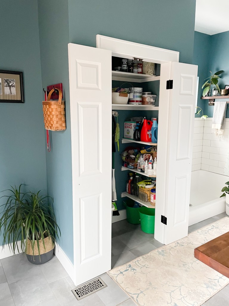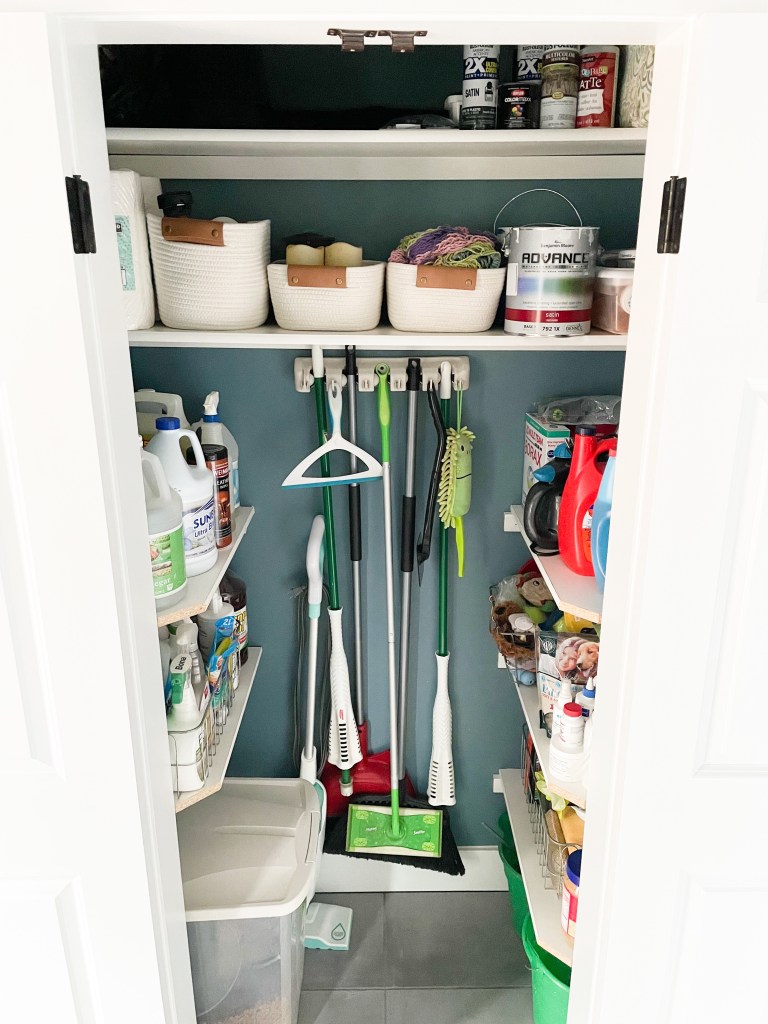 I designed the closet so that it would hold our tall items (brooms, mops etc.), while still having plenty of shelves for storing cleaning supplies and season items we use on the deck. Plenty of room for me to collect more crap!