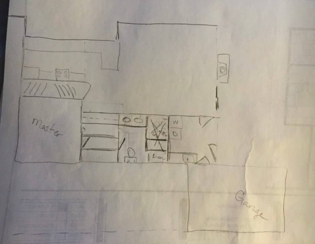 The architect originally had a U-shaped countertop with a sink in the center of the far wall, a closet on one side and the washer/dryer on the right. We wanted to have floor space for dog crates (at least two) so that didn’t work for us.